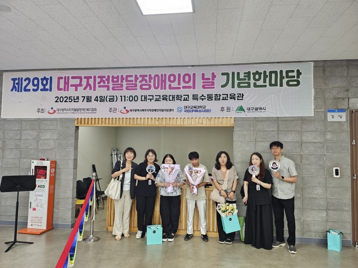 제29회 대구지적발달장애인의 날 기념행사 담당자 0 505 2025.08.20 17:58 지난 7월 4일 금요일 열린 제29회 대구지적발달장애인의 날 기념행사에 성보재활원이 함께했습니다. 뜻깊은 날, 세 분의 영광스러운 수상 소식을 전해드립니다!정영희 이용자: 제17회 장애인식개선 작품 공모전 특선김천식 이용자: 2025년 대구발달장애인 자기권리주장대회 '내 마음속 이야기' 주장상박영숙 선생님: 제29회 대구지적발달장애인의 날 기념 한마당 대회장 표창모두에게 축하와 격려를 보냅니다! 성보재활원은 앞으로도 지적발달장애인들의 행복과 자립을 위해 노력하겠습니다.