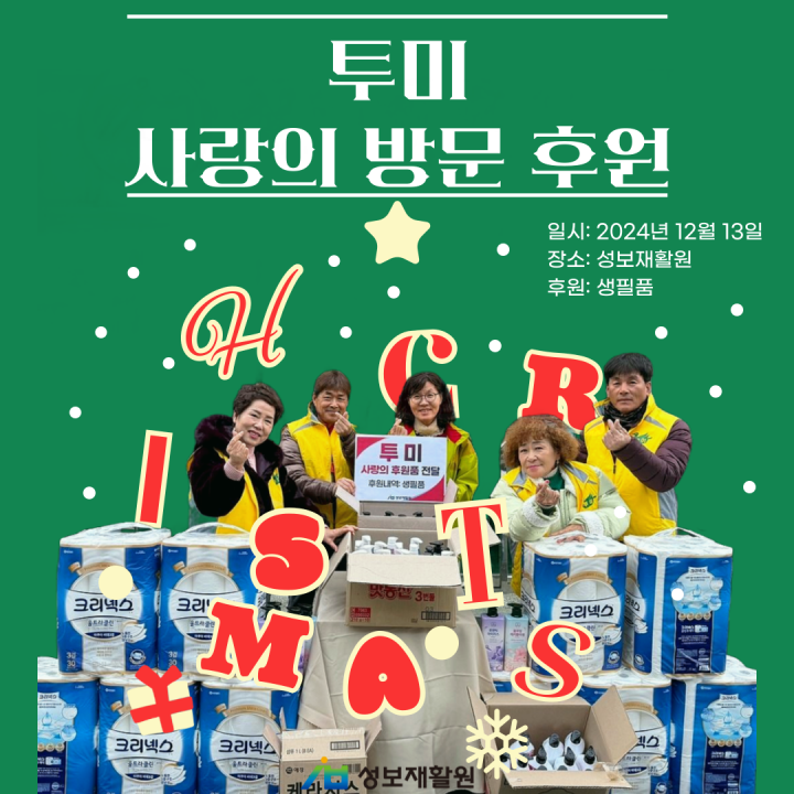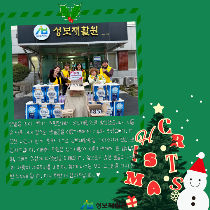 연말을 맞아 "투미" 후원단체가 성보재활원을 방문했습니다. 이들은 연중 내내 필요한 생필품을 이용자들에게 기부해 주셨습니다. 따뜻한 나눔과 함께 환한 미소로 성보재활원을 찾아주셔서 진심으로 감사드립니다. 이러한 후원은 성보재활원 이용자들에게 큰 힘이 되며, 그들의 일상에 따뜻함을 더해줍니다.