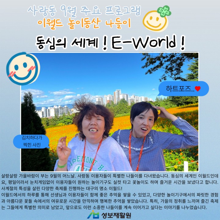 살랑살랑 가을바람이 부는 9월의 어느날. 사랑동 이용자들이 특별한 나들이를 다녀왔습니다. 동심의 세계인 이월드인데요, 평일이라서 눈치게임없이 이용자들이 원하는 놀이기구도 실컷 타고 꽃놀이도 하며 즐거운 시간을 보냈다고 합니다. 사계절의 특성을 살린 다양한 축제를 진행하는 대구의 명소 이월드!