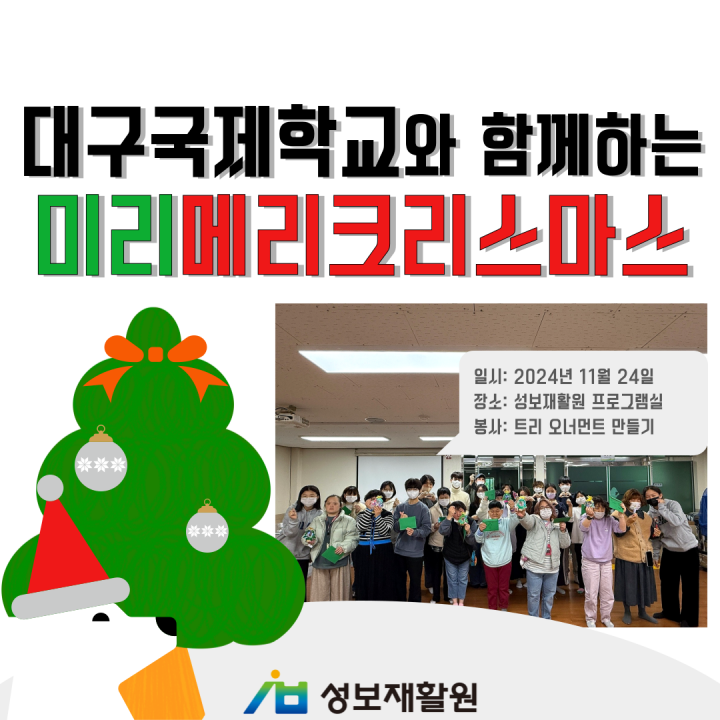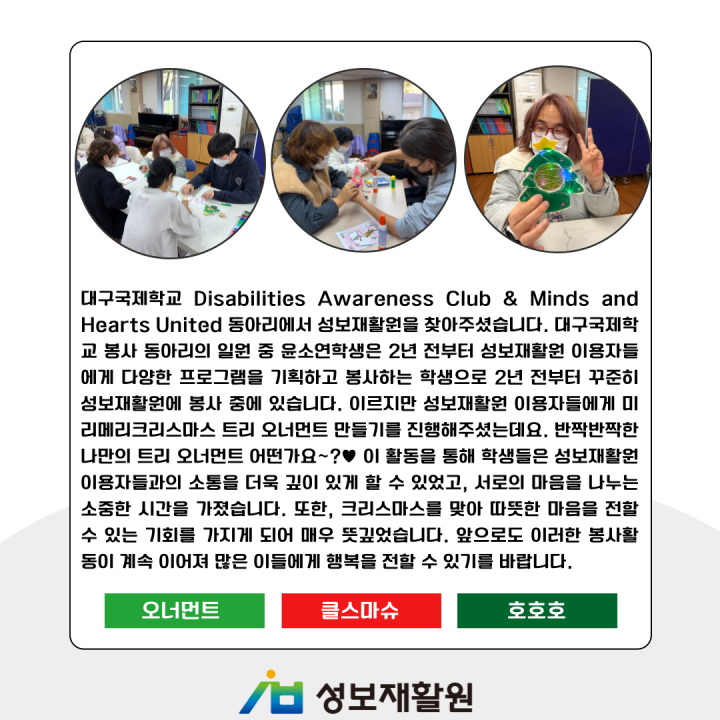 대구국제학교 Disabilities Awareness Club & Minds and Hearts United 동아리에서 성보재활원을 찾아주셨습니다. 대구국제학교 봉사 동아리의 일원 중 윤소연학생은 2년 전부터 성보재활원 이용자들에게 다양한 프로그램을 기획하고 봉사하는 학생으로 2년 전부터 꾸준히 성보재활원에 봉사 중에 있습니다. 이르지만 성보재활원 이용자들에게 미리메리크리스마스 트리 오너먼트 만들기를 진행해주셨는데요. 반짝반짝한 나만의 트리 오너먼트 어떤가요~?♥