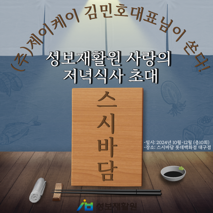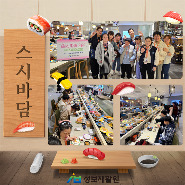 성보재활원 이용자들과 직원들이 함께하는 행복한 시간이 특별한 사랑의 식사 초대를 받았다고 전해집니다. 이 자리는 성보재활원에 지속적으로 도움을 주시는 주식회사 제이케이의 김민호 대표님이 운영하는 스시바담 회전 초밥에서 마련되었습니다. 스시바담은 대구 롯데백화점에 위치해 있으며, 맛있는 음식으로 유명한 곳입니다.