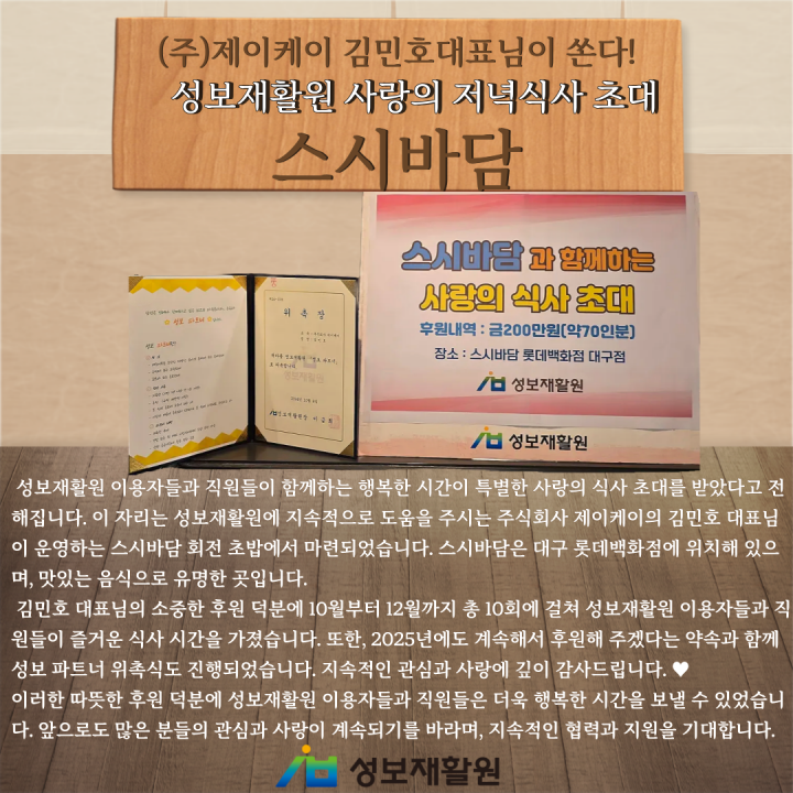 (주)제이케이 김민호대표님이 쏜다! 성보재활원 사랑의 저녁식사 초대