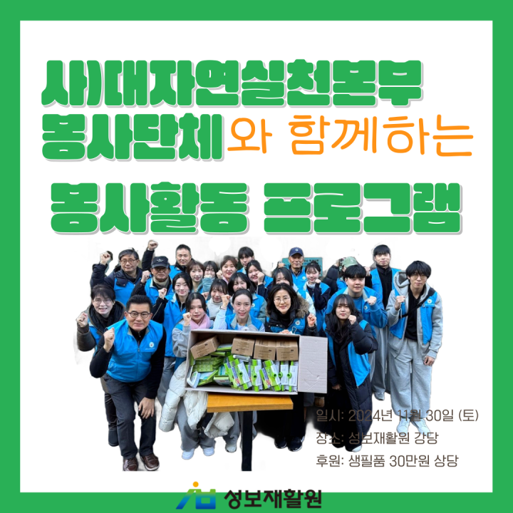 2024년 11월의 마지막 주말에 반가운 봉사자님들이 찾아주셨습니다. 바로 사단법인 대자연실천본부 봉사단체인데요. 대자연실천본부 봉사단체는 대구한의대학교 소속 교수님, 학생 동아리 등의 다양한 연령대로 이루어진 다재다능한 봉사단체입니다.