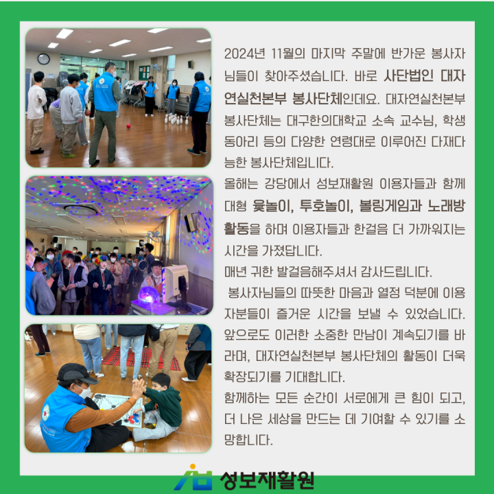 봉사자님들의 따뜻한 마음과 열정 덕분에 이용자분들이 즐거운 시간을 보낼 수 있었습니다. 앞으로도 이러한 소중한 만남이 계속되기를 바라며, 대자연실천본부 봉사단체의 활동이 더욱 확장되기를 기대합니다.