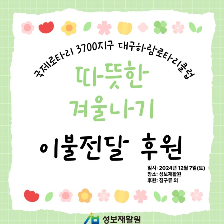 12월 7일 토요일, 성보재활원 이용자들에게 따뜻한 선물을 전하기 위해 방문한 분들이 계십니다. 그분들은 바로 국제로타리 3700지구 대구하람로타리클럽의 박상우 회장님과 김종혁 후원자님입니다. 박상우 회장님은 "배려와 양보로 하나되는 하람로타리"라는 슬로건 아래 성보재활원뿐만 아니라 지역 사회에도 긍정적인 영향을 미치고 계신다고 합니다. 성보재활원 이용자들이 따뜻한 겨울을 보낼 수 있도록 도움을 주셔서 진심으로 감사드립니다. ♥