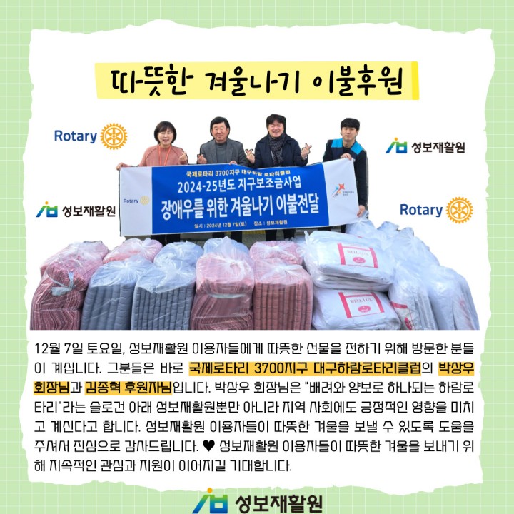 성보재활원 이용자들이 따뜻한 겨울을 보내기 위해 지속적인 관심과 지원이 이어지길 기대합니다.