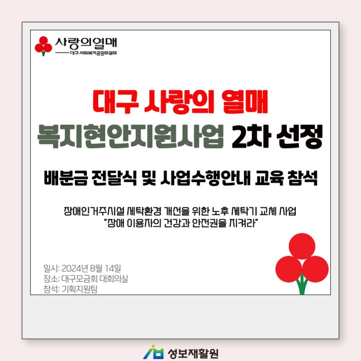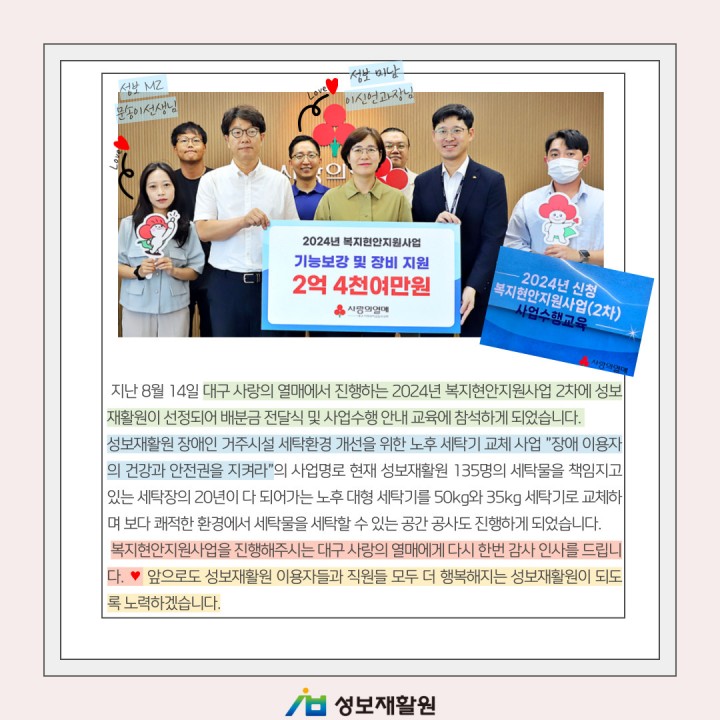 지난 8월 14일 대구 사랑의 열매에서 진행하는 2024년 복지현안지원사업 2차에 성보재활원이 선정되어 배분금 전달식 및 사업수행 안내 교육에 참석하게 되었습니다.