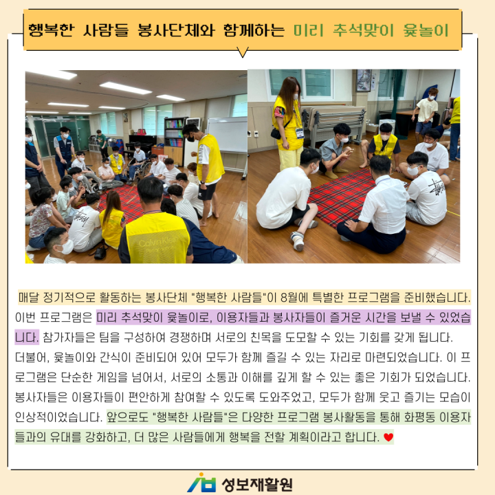 매달 정기적으로 활동하는 봉사단체 "행복한 사람들"이 8월에 특별한 프로그램을 준비했습니다. 이번 프로그램은 미리 추석맞이 윷놀이로, 이용자들과 봉사자들이 즐거운 시간을 보낼 수 있었습니다. 참가자들은 팀을 구성하여 경쟁하며 서로의 친목을 도모할 수 있는 기회를 갖게 됩니다.