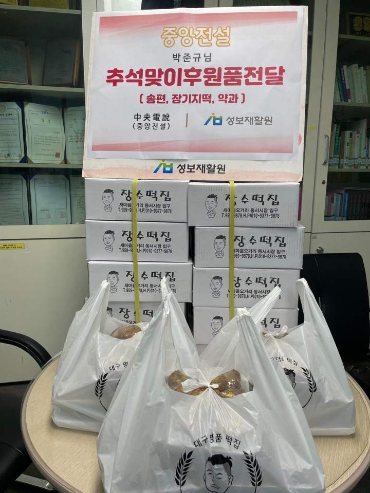 중앙전설 박준규후원자님 추석맞이 후원품 전달❤ 담당자 0 1070 2024.09.13 16:51 중앙전설 박준규후원자님 추석맞이 후원품 전달❤-일시: 2024년 9월 13일-후원: 추석 떡 350,000원 상당수년간 성보재활원 이용자들에게 명절 떡을 후원해주시는 박준규후원자님께서 따뜻한 나눔을 실천해주셨습니다.이용자들이 다양하게 섭취하도록 송편과 장기지와 약과까지!매년 성보재활원 이용자들이 풍성한 명절을 보낼 수 있도록 도움을 주셔서 감사드립니다.