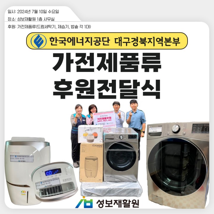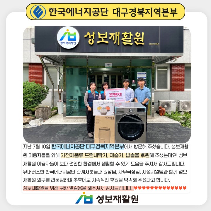 지난 7월 10일 한국에너지공단 대구경북지역본부에서 방문해 주셨습니다. 성보재활원 이용자들을 위해 가전제품류 드럼세탁기, 제습기, 밥솥을 후원해 주셨는데요! 성보재활원 이용자들이 보다 편안한 환경에서 생활할 수 있게 도움을 주셔서 감사드립니다. 유머러스한 한국에너지공단 관계자분들과 원장님, 사무국장님, 시설지원팀과 함께 성보재활원 외부를 라운딩하며 추후에도 지속적인 후원을 약속해 주셨다고 합니다.