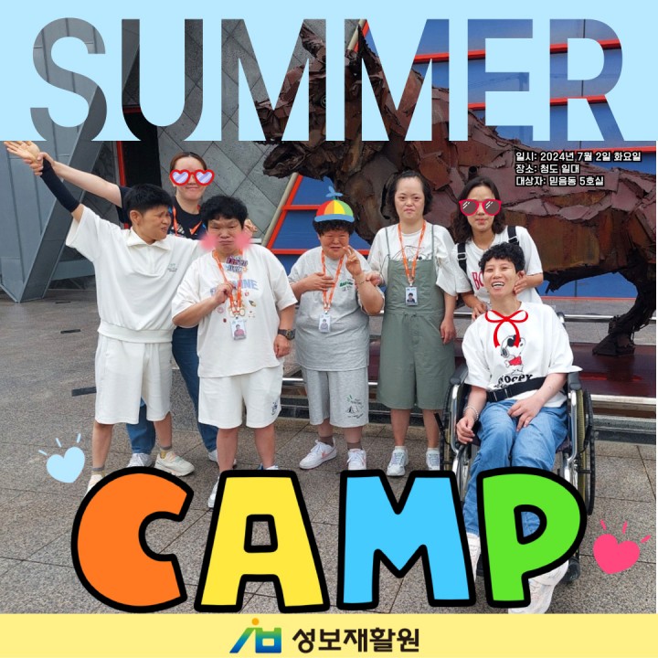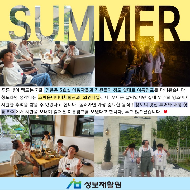 믿음동 5호실 Summer Camp 담당자 0 1272 2024.07.26 11:31 믿음동 5호실 Summer Camp 일시: 2024년 7월 2일(화)-장소: 청도 일대-대상: 믿음동 5호실 이용자 및 직원푸른 빛이 맴도는 7월, 믿음동 5호실 이용자들과 직원들이 청도 일대로 여름캠프를 다녀왔습니다. 청도하면 생각나는 소싸움미디어체험관과 와인터널까지! 무더운 날씨였지만 실내 위주의 명소에서 시원한 추억을 쌓을 수 있었다고 합니다. 놀러가면 가장 중요한 음식!!청도의 맛집 투어와 대형 핫플 카페에서 시간을 보내며 즐거운 여름캠프를 보냈다고 합니다. 수고 많으셨습니다. ♥