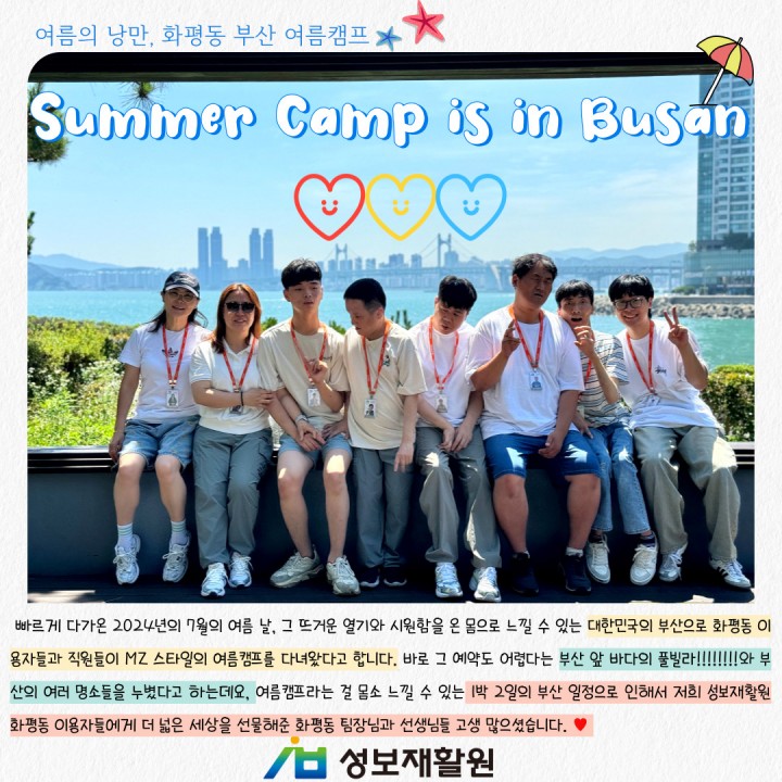 빠르게 다가온 2024년의 7월의 여름 날, 그 뜨거운 열기와 시원함을 온 몸으로 느낄 수 있는 대한민국의 부산으로 화평동 이용자들과 직원들이 MZ 스타일의 여름캠프를 다녀왔다고 합니다.