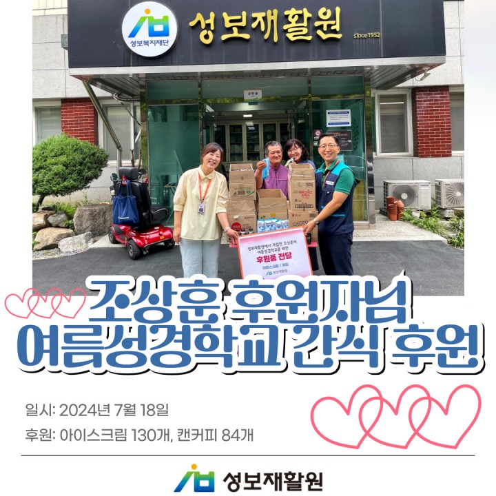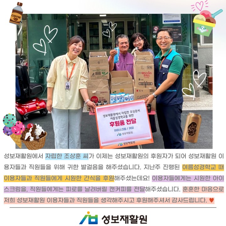 조상훈 후원자님 여름성경학교 간식 후원 담당자 0 1886 2024.07.26 11:39 조상훈 후원자님 여름성경학교 간식 후원- 일시: 2024년 7월 18일- 후원: 아이스크림 130개, 캔커피 84개성보재활원에서 자립한 조상훈 씨가 이제는 성보재활원의 후원자가 되어 성보재활원 이용자들과 직원들을 위해 귀한 발걸음을 해주셨습니다. 지난주 진행된 여름성경학교 때 이용자들과 직원들에게 시원한 간식을 후원해주셨는데요! 이용자들에게는 시원한 아이스크림을, 직원들에게는 피로를 날려버릴 캔커피를 전달해주셨습니다. 훈훈한 마음으로 저희 성보재활원 이용자들과 직원들을 생각해주시고 후원해주셔서 감사드립니다. ♥