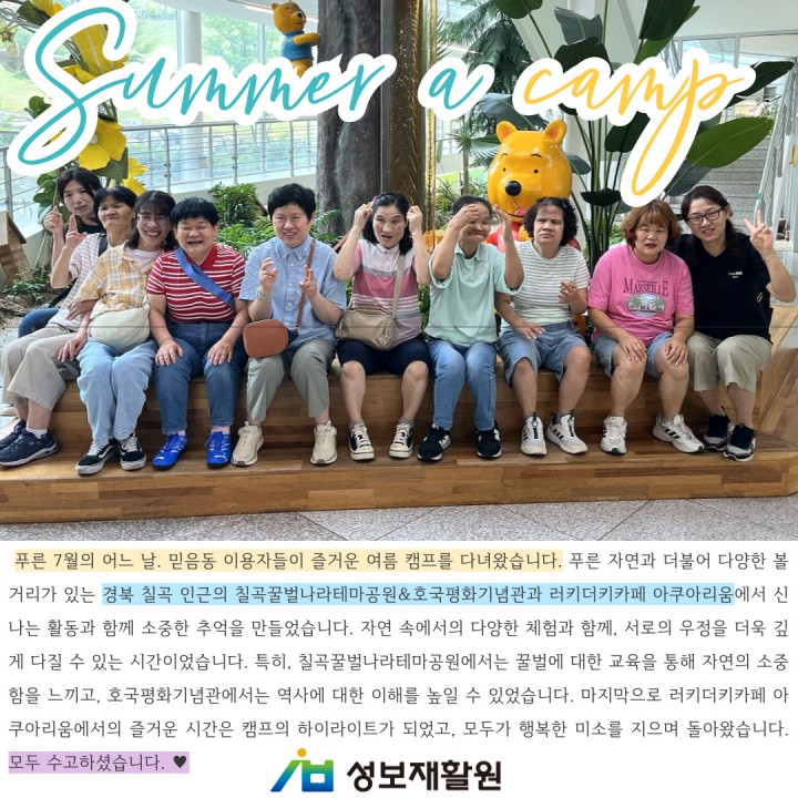 푸른 7월의 어느 날. 믿음동 이용자들이 즐거운 여름 캠프를 다녀왔습니다. 푸른 자연과 더불어 다양한 볼거리가 있는 경북 칠곡 인근의 칠곡꿀벌나라테마공원&호국평화기념관과 러키더키카페 아쿠아리움에서 신나는 활동과 함께 소중한 추억을 만들었습니다. 자연 속에서의 다양한 체험과 함께, 서로의 우정을 더욱 깊게 다질 수 있는 시간이었습니다. 특히, 칠곡꿀벌나라테마공원에서는 꿀벌에 대한 교육을 통해 자연의 소중함을 느끼고, 호국평화기념관에서는 역사에 대한 이해를 높일 수 있었습니다. 마지막으로 러키더키카페 아쿠아리움에서의 즐거운 시간은 캠프의 하이라이트가 되었고, 모두가 행복한 미소를 지으며 돌아왔습니다. 모두 수고하셨습니다. ♥