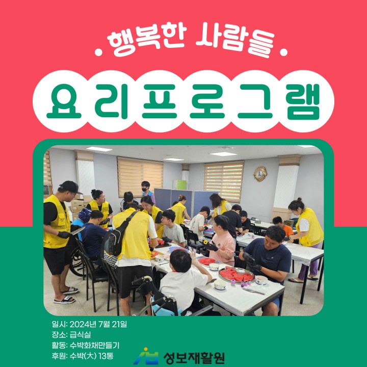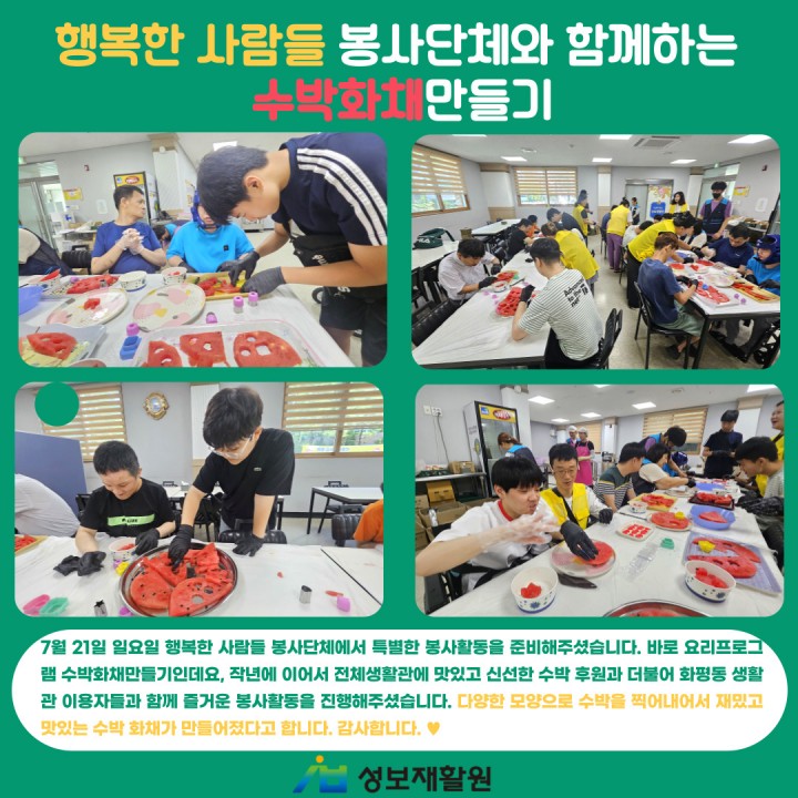 행복한 사람들 봉사단체와 함께하는 요리프로그램 담당자 0 927 2024.08.12 18:15 행복한 사람들 봉사단체와 함께하는 요리프로그램 일시: 2024년 7월 21일장소: 급식실활동: 수박화채만들기후원: 수박(大) 13통7월 21일 일요일 행복한 사람들 봉사단체에서 특별한 봉사활동을 준비해주셨습니다. 바로 요리프로그램 수박화채만들기인데요, 작년에 이어서 전체생활관에 맛있고 신선한 수박 후원과 더불어 화평동 생활관 이용자들과 함께 즐거운 봉사활동을 진행해주셨습니다. 다양한 모양으로 수박을 찍어내어서 재밌고 맛있는 수박 화채가 만들어졌다고 합니다. 감사합니다. ♥