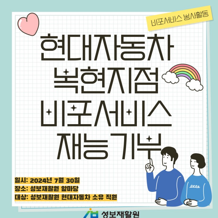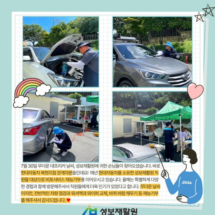 7월 30일 무더운 대프리카 날씨, 성보재활원에 귀한 손님들이 찾아오셨습니다. 바로 현대자동차 복현지점 관계자분들인데요! 매년 현대자동차를 소유한 성보재활원 직원들 대상으로 비포서비스 재능기부를 이어오시고 있습니다. 올해는 특별하게 다양한 경험과 함께 방문해주셔서 직원들에게 더욱 인기가 있었다고 합니다. 무더운 날씨이지만, 전반적인 차량 점검과 워셔액과 와이퍼 교체, 바퀴 바람 채우기 등 재능기부를 해주셔서 감사드립니다. ♥
