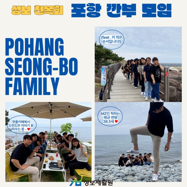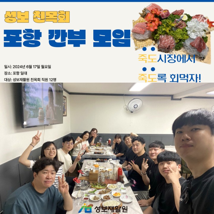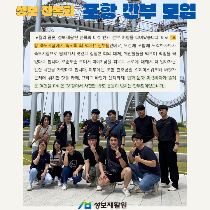 6월의 중순, 성보재활원 친목회 다섯 번째 깐부 여행을 다녀왔습니다. 바로 "포항 죽도시장에서 죽도록 회 먹자!" 깐부팀인데요, 오전에 포항에 도착하자마자 죽도시장으로 달려가서 맛있고 싱싱한 회와 대게, 해산물들을 먹으며 먹방을 찍었다고 합니다. 오순도순 모여서 이야기꽃을 피우고 서로에 대해서 더 알아가는 값진 시간을 가졌다고 합니다. 이후에는 포항 환호공원 스페이스워크와 바닷가 근처에 위치한 핫플 카페, 그리고 바닷가 산책까지! 입과 눈과 귀 3박자가 즐거운 여행을 다녀온 것 같아서 사진만 봐도 웃음이 넘치는 깐부팀이었습니다.