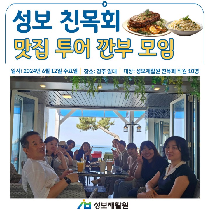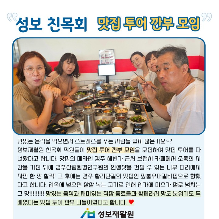 성보재활원 친목회 직원들이 맛집 투어 깐부 모임을 모집하여 맛집 투어를 다녀왔다고 합니다. 맛집의 메카인 경주 해변가 근처 브런치 카페에서 소통의 시간을 가진 뒤에 경주산림환경연구원의 인생샷을 건질 수 있는 나무 다리에서 사진 한 장 찰칵! 그 후에는 경주 황리단길의 맛집인 짚불우대갈비집으로 향했다고 합니다. 입속에 넣으면 살살 녹는 고기로 인해 입가에 미소가 절로 넘치는 그 맛!!!!!!!!! 맛있는 음식과 재미있는 직장 동료들과 함께라서 맛도 분위기도 두 배였다는 맛집 투어 깐부 나들이였다고 합니다. ♥
