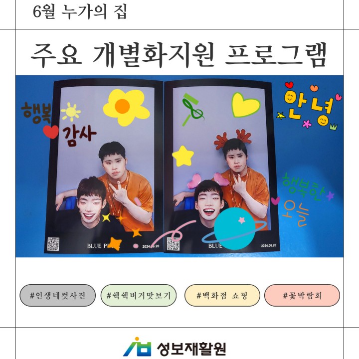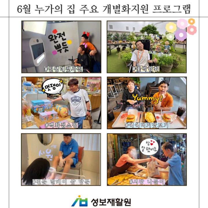 성보재활원 6월 누가의집 주요 개별화지원 프로그램 담당자 0 2474 2024.06.27 15:52 성보재활원 6월 누가의집 주요 개별화지원 프로그램"성보재활원은 이용자들에게 개별화 지원 프로그램을 통해서 욕구를 충족시키고 지역사회의 일원으로서 행복한 삶을 누릴 수 있도록 지원 중에 있습니다.""다양한 경험"을 통한 "행복"이 넘치는 누가의 집의 6월 개별화지원프로그램! 개별화지원프로그램 한 번 살펴보아요.