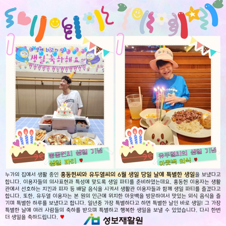 누가의 집에서 생활 중인 홍동헌씨와 유두열씨의 6월 생일 당일 날에 특별한 생일을 보냈다고 합니다. 이용자들의 의사표현과 특성에 맞도록 생일 파티를 준비하였는데요, 홍동헌 이용자는 생활관에서 선호하는 치킨과 피자 등 배달 음식을 시켜서 생활관 이용자들과 함께 생일 파티를 즐겼다고 합니다. 또한, 유두열 이용자는 본 원의 인근에 위치한 아웃백을 방문하여서 맛있는 외식 음식을 즐기며 특별한 하루를 보냈다고 합니다. 일년중 가장 특별하다고 하면 특별한 날인 바로 생일! 그 가장 특별한 날에 여러 사람들의 축하를 받으며 특별하고 행복한 생일을 보낼 수 있었습니다. 다시 한번 더 생일을 축하드립니다. ♥