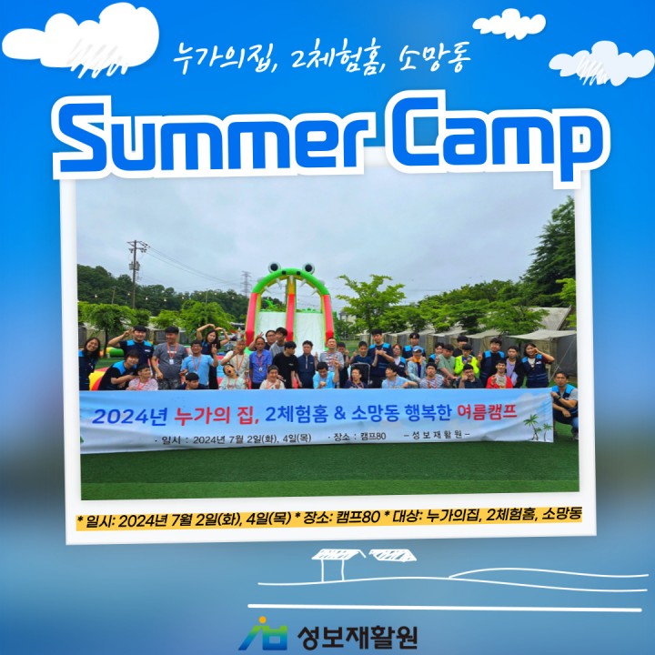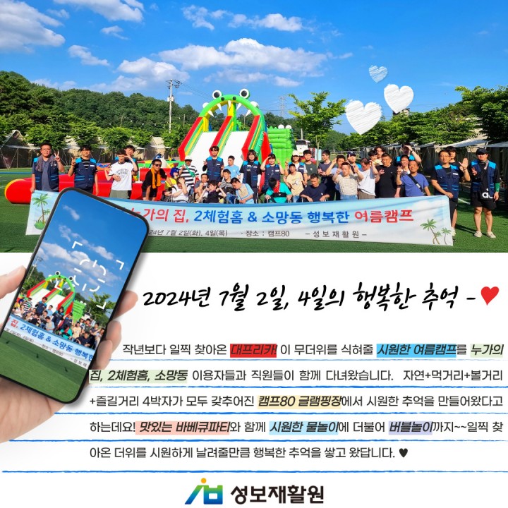 누가의집, 2체험홈, 소망동 Summer Camp 담당자 0 1471 2024.07.12 15:34 누가의집, 2체험홈, 소망동 Summer Camp -일시: 2024년 7월 2일(화), 4(목)-장소: 캠프80-대상: 누가의집, 2체험홈, 소망동 작년보다 일찍 찾아온 대프리카! 이 무더위를 식혀줄 시원한 여름캠프를 누가의 집, 2체험홈, 소망동 이용자들과 직원들이 함께 다녀왔습니다. 자연+먹거리+볼거리+즐길거리 4박자가 모두 갖추어진 캠프80 글램핑장에서 시원한 추억을 만들어왔다고 하는데요! 맛있는 바베큐파티와 함께 시원한 물놀이에 더불어 버블놀이까지~~일찍 찾아온 더위를 시원하게 날려줄만큼 행복한 추억을 쌓고 왔답니다. ♥
